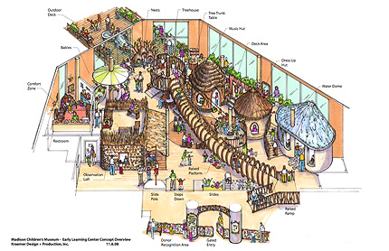 The Early Learning Gallery in MCM’s new location will be built entirely out of local, native and sustainably harvested materials found within 100 miles of Madison. In this space, young learners will be able to explore cause and effect phenomena, spatial relationships, shapes, patterns, gravity, measurement, properties of water, culture and literacy materials through activities that facilitate independence, encourage self-expression and foster their connection to the natural world.