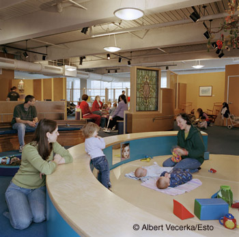 The Children's Museum's commitment to green design is reflected in all exhibit areas. It is especially important in the Nursery where our youngest children explore, play and learn. Inspired by the Reggio Emilio approach to early childhood, beautiful materials and artwork are assembled to create a place where families feel safe and free to explore with their youngest children. Sustainable materials including bamboo, wheat board and anti-microbial treated textiles are used throughout. Natural light from large windows illuminate the space and cast dapples of color as it shines through beautiful historic stained glass.